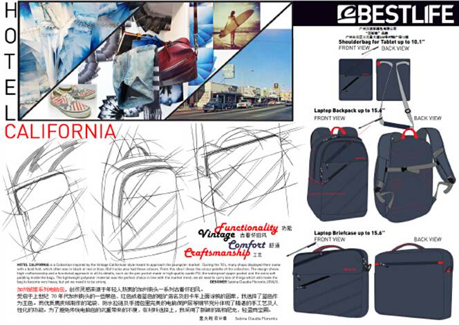 “加州旅馆”电脑包系列由汉诺斯设计团队意大利设计师“Sabina”设计。Sabina,2013年7月加入汉诺斯,现任研发设计部产品设计师